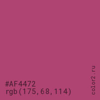 Цвет #AF4472 в цветовой модели RGB обозначается тремя октетами (175, 68, 114) в десятичном формате и #AF4472 в шестнадцатиричном (hex) формате, которые являются интенсивностью красного 175 (hex AF), интенсивность зелёного 68 (hex 44) и интенсивность синего 114 (hex 72).