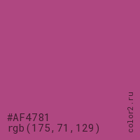 Цвет #AF4781 в цветовой модели RGB обозначается тремя октетами (175, 71, 129) в десятичном формате и #AF4781 в шестнадцатиричном (hex) формате, которые являются интенсивностью красного 175 (hex AF), интенсивность зелёного 71 (hex 47) и интенсивность синего 129 (hex 81).