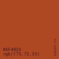 Цвет #AF4823 в цветовой модели RGB обозначается тремя октетами (175, 72, 35) в десятичном формате и #AF4823 в шестнадцатиричном (hex) формате, которые являются интенсивностью красного 175 (hex AF), интенсивность зелёного 72 (hex 48) и интенсивность синего 35 (hex 23).