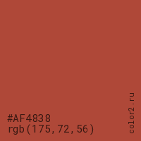 Цвет #AF4838 в цветовой модели RGB обозначается тремя октетами (175, 72, 56) в десятичном формате и #AF4838 в шестнадцатиричном (hex) формате, которые являются интенсивностью красного 175 (hex AF), интенсивность зелёного 72 (hex 48) и интенсивность синего 56 (hex 38).