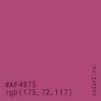 Цвет #AF4875 в цветовой модели RGB обозначается тремя октетами (175, 72, 117) в десятичном формате и #AF4875 в шестнадцатиричном (hex) формате, которые являются интенсивностью красного 175 (hex AF), интенсивность зелёного 72 (hex 48) и интенсивность синего 117 (hex 75).