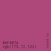 Цвет #AF487A в цветовой модели RGB обозначается тремя октетами (175, 72, 122) в десятичном формате и #AF487A в шестнадцатиричном (hex) формате, которые являются интенсивностью красного 175 (hex AF), интенсивность зелёного 72 (hex 48) и интенсивность синего 122 (hex 7A).