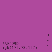 Цвет #AF499D в цветовой модели RGB обозначается тремя октетами (175, 73, 157) в десятичном формате и #AF499D в шестнадцатиричном (hex) формате, которые являются интенсивностью красного 175 (hex AF), интенсивность зелёного 73 (hex 49) и интенсивность синего 157 (hex 9D).