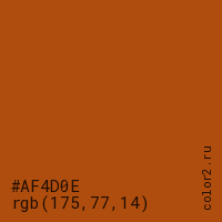 Цвет #AF4D0E в цветовой модели RGB обозначается тремя октетами (175, 77, 14) в десятичном формате и #AF4D0E в шестнадцатиричном (hex) формате, которые являются интенсивностью красного 175 (hex AF), интенсивность зелёного 77 (hex 4D) и интенсивность синего 14 (hex 0E).