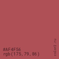 Цвет #AF4F56 в цветовой модели RGB обозначается тремя октетами (175, 79, 86) в десятичном формате и #AF4F56 в шестнадцатиричном (hex) формате, которые являются интенсивностью красного 175 (hex AF), интенсивность зелёного 79 (hex 4F) и интенсивность синего 86 (hex 56).