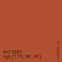 Цвет #AF5031 в цветовой модели RGB обозначается тремя октетами (175, 80, 49) в десятичном формате и #AF5031 в шестнадцатиричном (hex) формате, которые являются интенсивностью красного 175 (hex AF), интенсивность зелёного 80 (hex 50) и интенсивность синего 49 (hex 31).