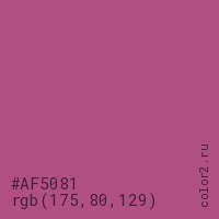 Цвет #AF5081 в цветовой модели RGB обозначается тремя октетами (175, 80, 129) в десятичном формате и #AF5081 в шестнадцатиричном (hex) формате, которые являются интенсивностью красного 175 (hex AF), интенсивность зелёного 80 (hex 50) и интенсивность синего 129 (hex 81).