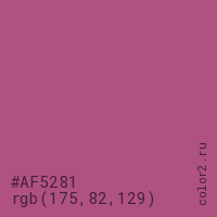 Цвет #AF5281 в цветовой модели RGB обозначается тремя октетами (175, 82, 129) в десятичном формате и #AF5281 в шестнадцатиричном (hex) формате, которые являются интенсивностью красного 175 (hex AF), интенсивность зелёного 82 (hex 52) и интенсивность синего 129 (hex 81).