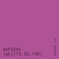 Цвет #AF5296 в цветовой модели RGB обозначается тремя октетами (175, 82, 150) в десятичном формате и #AF5296 в шестнадцатиричном (hex) формате, которые являются интенсивностью красного 175 (hex AF), интенсивность зелёного 82 (hex 52) и интенсивность синего 150 (hex 96).