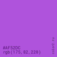 Цвет #AF52DC в цветовой модели RGB обозначается тремя октетами (175, 82, 220) в десятичном формате и #AF52DC в шестнадцатиричном (hex) формате, которые являются интенсивностью красного 175 (hex AF), интенсивность зелёного 82 (hex 52) и интенсивность синего 220 (hex DC).