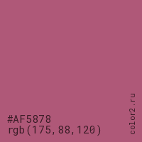 Цвет #AF5878 в цветовой модели RGB обозначается тремя октетами (175, 88, 120) в десятичном формате и #AF5878 в шестнадцатиричном (hex) формате, которые являются интенсивностью красного 175 (hex AF), интенсивность зелёного 88 (hex 58) и интенсивность синего 120 (hex 78).