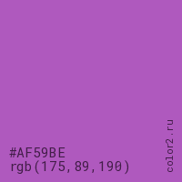 Цвет #AF59BE в цветовой модели RGB обозначается тремя октетами (175, 89, 190) в десятичном формате и #AF59BE в шестнадцатиричном (hex) формате, которые являются интенсивностью красного 175 (hex AF), интенсивность зелёного 89 (hex 59) и интенсивность синего 190 (hex BE).