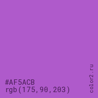 Цвет #AF5ACB в цветовой модели RGB обозначается тремя октетами (175, 90, 203) в десятичном формате и #AF5ACB в шестнадцатиричном (hex) формате, которые являются интенсивностью красного 175 (hex AF), интенсивность зелёного 90 (hex 5A) и интенсивность синего 203 (hex CB).
