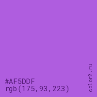 Цвет #AF5DDF в цветовой модели RGB обозначается тремя октетами (175, 93, 223) в десятичном формате и #AF5DDF в шестнадцатиричном (hex) формате, которые являются интенсивностью красного 175 (hex AF), интенсивность зелёного 93 (hex 5D) и интенсивность синего 223 (hex DF).