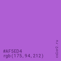 Цвет #AF5ED4 в цветовой модели RGB обозначается тремя октетами (175, 94, 212) в десятичном формате и #AF5ED4 в шестнадцатиричном (hex) формате, которые являются интенсивностью красного 175 (hex AF), интенсивность зелёного 94 (hex 5E) и интенсивность синего 212 (hex D4).