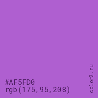 Цвет #AF5FD0 в цветовой модели RGB обозначается тремя октетами (175, 95, 208) в десятичном формате и #AF5FD0 в шестнадцатиричном (hex) формате, которые являются интенсивностью красного 175 (hex AF), интенсивность зелёного 95 (hex 5F) и интенсивность синего 208 (hex D0).