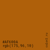 Цвет #AF600A в цветовой модели RGB обозначается тремя октетами (175, 96, 10) в десятичном формате и #AF600A в шестнадцатиричном (hex) формате, которые являются интенсивностью красного 175 (hex AF), интенсивность зелёного 96 (hex 60) и интенсивность синего 10 (hex 0A).