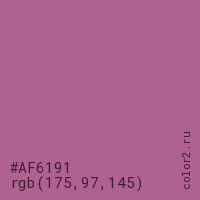 Цвет #AF6191 в цветовой модели RGB обозначается тремя октетами (175, 97, 145) в десятичном формате и #AF6191 в шестнадцатиричном (hex) формате, которые являются интенсивностью красного 175 (hex AF), интенсивность зелёного 97 (hex 61) и интенсивность синего 145 (hex 91).