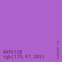 Цвет #AF61CB в цветовой модели RGB обозначается тремя октетами (175, 97, 203) в десятичном формате и #AF61CB в шестнадцатиричном (hex) формате, которые являются интенсивностью красного 175 (hex AF), интенсивность зелёного 97 (hex 61) и интенсивность синего 203 (hex CB).