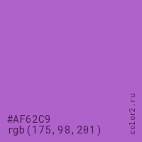 Цвет #AF62C9 в цветовой модели RGB обозначается тремя октетами (175, 98, 201) в десятичном формате и #AF62C9 в шестнадцатиричном (hex) формате, которые являются интенсивностью красного 175 (hex AF), интенсивность зелёного 98 (hex 62) и интенсивность синего 201 (hex C9).