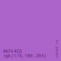 Цвет #AF64CD в цветовой модели RGB обозначается тремя октетами (175, 100, 205) в десятичном формате и #AF64CD в шестнадцатиричном (hex) формате, которые являются интенсивностью красного 175 (hex AF), интенсивность зелёного 100 (hex 64) и интенсивность синего 205 (hex CD).