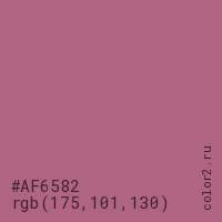 Цвет #AF6582 в цветовой модели RGB обозначается тремя октетами (175, 101, 130) в десятичном формате и #AF6582 в шестнадцатиричном (hex) формате, которые являются интенсивностью красного 175 (hex AF), интенсивность зелёного 101 (hex 65) и интенсивность синего 130 (hex 82).