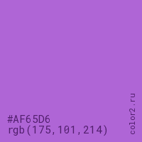 Цвет #AF65D6 в цветовой модели RGB обозначается тремя октетами (175, 101, 214) в десятичном формате и #AF65D6 в шестнадцатиричном (hex) формате, которые являются интенсивностью красного 175 (hex AF), интенсивность зелёного 101 (hex 65) и интенсивность синего 214 (hex D6).