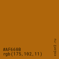 Цвет #AF660B в цветовой модели RGB обозначается тремя октетами (175, 102, 11) в десятичном формате и #AF660B в шестнадцатиричном (hex) формате, которые являются интенсивностью красного 175 (hex AF), интенсивность зелёного 102 (hex 66) и интенсивность синего 11 (hex 0B).