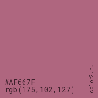 Цвет #AF667F в цветовой модели RGB обозначается тремя октетами (175, 102, 127) в десятичном формате и #AF667F в шестнадцатиричном (hex) формате, которые являются интенсивностью красного 175 (hex AF), интенсивность зелёного 102 (hex 66) и интенсивность синего 127 (hex 7F).