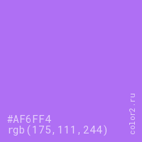Цвет #AF6FF4 в цветовой модели RGB обозначается тремя октетами (175, 111, 244) в десятичном формате и #AF6FF4 в шестнадцатиричном (hex) формате, которые являются интенсивностью красного 175 (hex AF), интенсивность зелёного 111 (hex 6F) и интенсивность синего 244 (hex F4).