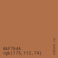 Цвет #AF704A в цветовой модели RGB обозначается тремя октетами (175, 112, 74) в десятичном формате и #AF704A в шестнадцатиричном (hex) формате, которые являются интенсивностью красного 175 (hex AF), интенсивность зелёного 112 (hex 70) и интенсивность синего 74 (hex 4A).