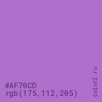 Цвет #AF70CD в цветовой модели RGB обозначается тремя октетами (175, 112, 205) в десятичном формате и #AF70CD в шестнадцатиричном (hex) формате, которые являются интенсивностью красного 175 (hex AF), интенсивность зелёного 112 (hex 70) и интенсивность синего 205 (hex CD).
