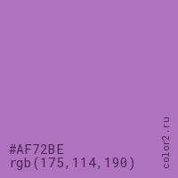 Цвет #AF72BE в цветовой модели RGB обозначается тремя октетами (175, 114, 190) в десятичном формате и #AF72BE в шестнадцатиричном (hex) формате, которые являются интенсивностью красного 175 (hex AF), интенсивность зелёного 114 (hex 72) и интенсивность синего 190 (hex BE).