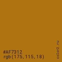 Цвет #AF7312 в цветовой модели RGB обозначается тремя октетами (175, 115, 18) в десятичном формате и #AF7312 в шестнадцатиричном (hex) формате, которые являются интенсивностью красного 175 (hex AF), интенсивность зелёного 115 (hex 73) и интенсивность синего 18 (hex 12).