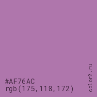 Цвет #AF76AC в цветовой модели RGB обозначается тремя октетами (175, 118, 172) в десятичном формате и #AF76AC в шестнадцатиричном (hex) формате, которые являются интенсивностью красного 175 (hex AF), интенсивность зелёного 118 (hex 76) и интенсивность синего 172 (hex AC).
