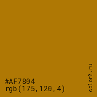 Цвет #AF7804 в цветовой модели RGB обозначается тремя октетами (175, 120, 4) в десятичном формате и #AF7804 в шестнадцатиричном (hex) формате, которые являются интенсивностью красного 175 (hex AF), интенсивность зелёного 120 (hex 78) и интенсивность синего 4 (hex 04).