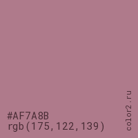 Цвет #AF7A8B в цветовой модели RGB обозначается тремя октетами (175, 122, 139) в десятичном формате и #AF7A8B в шестнадцатиричном (hex) формате, которые являются интенсивностью красного 175 (hex AF), интенсивность зелёного 122 (hex 7A) и интенсивность синего 139 (hex 8B).
