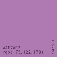 Цвет #AF7AB2 в цветовой модели RGB обозначается тремя октетами (175, 122, 178) в десятичном формате и #AF7AB2 в шестнадцатиричном (hex) формате, которые являются интенсивностью красного 175 (hex AF), интенсивность зелёного 122 (hex 7A) и интенсивность синего 178 (hex B2).