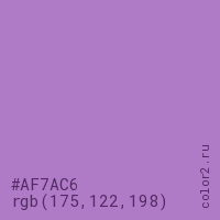 Цвет #AF7AC6 в цветовой модели RGB обозначается тремя октетами (175, 122, 198) в десятичном формате и #AF7AC6 в шестнадцатиричном (hex) формате, которые являются интенсивностью красного 175 (hex AF), интенсивность зелёного 122 (hex 7A) и интенсивность синего 198 (hex C6).