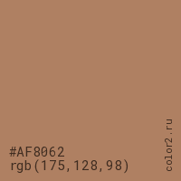 Цвет #AF8062 в цветовой модели RGB обозначается тремя октетами (175, 128, 98) в десятичном формате и #AF8062 в шестнадцатиричном (hex) формате, которые являются интенсивностью красного 175 (hex AF), интенсивность зелёного 128 (hex 80) и интенсивность синего 98 (hex 62).