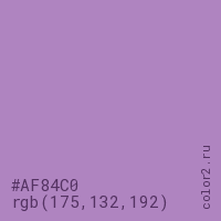Цвет #AF84C0 в цветовой модели RGB обозначается тремя октетами (175, 132, 192) в десятичном формате и #AF84C0 в шестнадцатиричном (hex) формате, которые являются интенсивностью красного 175 (hex AF), интенсивность зелёного 132 (hex 84) и интенсивность синего 192 (hex C0).