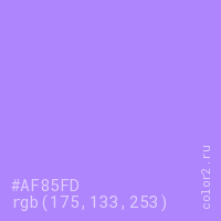 Цвет #AF85FD в цветовой модели RGB обозначается тремя октетами (175, 133, 253) в десятичном формате и #AF85FD в шестнадцатиричном (hex) формате, которые являются интенсивностью красного 175 (hex AF), интенсивность зелёного 133 (hex 85) и интенсивность синего 253 (hex FD).