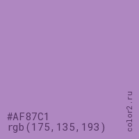 Цвет #AF87C1 в цветовой модели RGB обозначается тремя октетами (175, 135, 193) в десятичном формате и #AF87C1 в шестнадцатиричном (hex) формате, которые являются интенсивностью красного 175 (hex AF), интенсивность зелёного 135 (hex 87) и интенсивность синего 193 (hex C1).