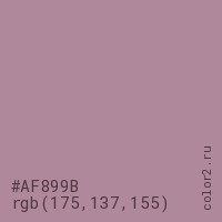 Цвет #AF899B в цветовой модели RGB обозначается тремя октетами (175, 137, 155) в десятичном формате и #AF899B в шестнадцатиричном (hex) формате, которые являются интенсивностью красного 175 (hex AF), интенсивность зелёного 137 (hex 89) и интенсивность синего 155 (hex 9B).