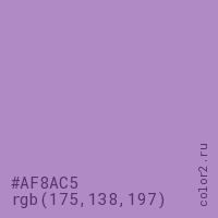 Цвет #AF8AC5 в цветовой модели RGB обозначается тремя октетами (175, 138, 197) в десятичном формате и #AF8AC5 в шестнадцатиричном (hex) формате, которые являются интенсивностью красного 175 (hex AF), интенсивность зелёного 138 (hex 8A) и интенсивность синего 197 (hex C5).