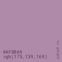Цвет #AF8BA9 в цветовой модели RGB обозначается тремя октетами (175, 139, 169) в десятичном формате и #AF8BA9 в шестнадцатиричном (hex) формате, которые являются интенсивностью красного 175 (hex AF), интенсивность зелёного 139 (hex 8B) и интенсивность синего 169 (hex A9).