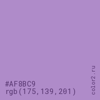 Цвет #AF8BC9 в цветовой модели RGB обозначается тремя октетами (175, 139, 201) в десятичном формате и #AF8BC9 в шестнадцатиричном (hex) формате, которые являются интенсивностью красного 175 (hex AF), интенсивность зелёного 139 (hex 8B) и интенсивность синего 201 (hex C9).