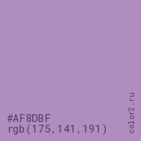 Цвет #AF8DBF в цветовой модели RGB обозначается тремя октетами (175, 141, 191) в десятичном формате и #AF8DBF в шестнадцатиричном (hex) формате, которые являются интенсивностью красного 175 (hex AF), интенсивность зелёного 141 (hex 8D) и интенсивность синего 191 (hex BF).