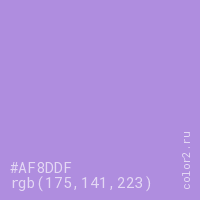 Цвет #AF8DDF в цветовой модели RGB обозначается тремя октетами (175, 141, 223) в десятичном формате и #AF8DDF в шестнадцатиричном (hex) формате, которые являются интенсивностью красного 175 (hex AF), интенсивность зелёного 141 (hex 8D) и интенсивность синего 223 (hex DF).