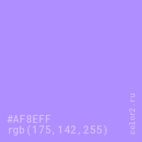 Цвет #AF8EFF в цветовой модели RGB обозначается тремя октетами (175, 142, 255) в десятичном формате и #AF8EFF в шестнадцатиричном (hex) формате, которые являются интенсивностью красного 175 (hex AF), интенсивность зелёного 142 (hex 8E) и интенсивность синего 255 (hex FF).